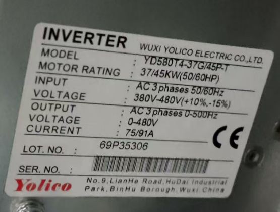 電機(jī)45KW,額定電流91A,額定轉(zhuǎn)速1480rpm,根據(jù)電機(jī)的型號,我司選擇了額定電流91A的型號為YD580T4-37G/45P-T變頻器
