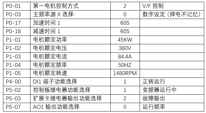 變頻器和電機(jī)之間存在一定距離,變頻器和電機(jī)都要做好接地的準(zhǔn)備?,F(xiàn)場變頻器帶45KW電機(jī),DI1給定端子啟動,AO1頻率輸出,一組繼電器TA1/TC1反饋運行信號,另一組TA2/TC2反饋報警信號。RST接電源,UVW接電機(jī)